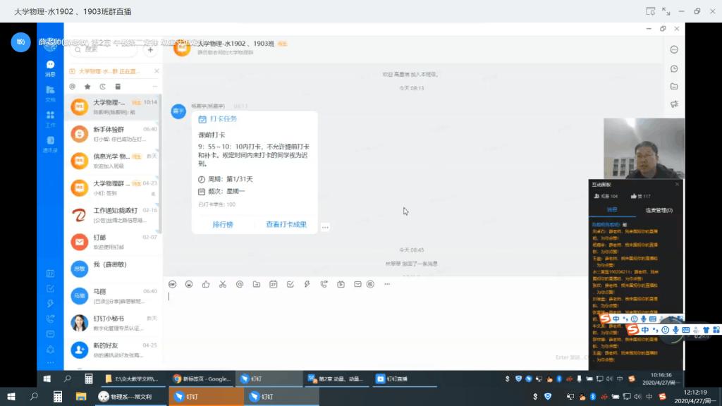 2、线上教学的督导。除学院的正常教学督导外,在学院春季教学工作领导小组的安排下,组成由教学副院长带队的14人临时督导小组。由张睿主任带队督导高等数学、经济数学、线性代数等数学类基础课程,常文利主任带队督导大学物理等物理类基础课程,李秦、杜宝军、田苗三位专业主任督导三个专业的专业课程。各位主任先是集中检查任课老师的督促学生学习情况、课程答疑情况、作业布置情况等,将汇总检查情况到教务办公室,教务办公室整理汇总后报督导组长,经组长审核后形成每周的学院周报(见附件:数理学院线上教学情况汇总表(1-8周),第九周在下周二汇总后上传)。同时各位督导还不定期查看任课教师保存的上课、答疑图片,特别是对毕业设计,工作小组加入了所有的指导答疑QQ群(或者微信群)。在前九周的督导过程中,督导们发现了一批认真负责的老师。学院督导们也整理了一些老师的工作经验供各位老师参考使用(见附件:前九周数理学院线上教学经验交流总结汇总及部分老师在线教学交流图片)。