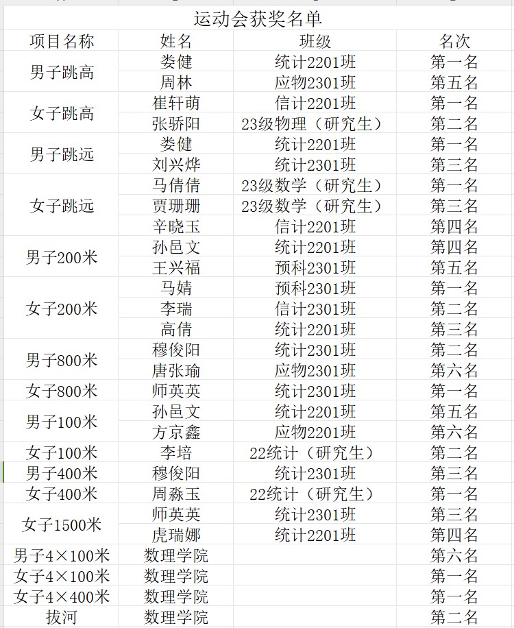 运动竞技不仅仅是意志的较量、速度的挑战,更是对一个团队凝聚力的考验。踏上跑道,是一种勇气。驰骋赛场,是一种顽强。本次运动会锻炼了同学们的体魄,激活了斗志,充分彰显了数理学子的风采。相信今天的成绩只是一个起点,我们会在今后的学习与生活中寻觅光彩和梦想,创造更多的美好与辉煌!