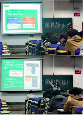 在文稿环节,团委副书记虎瑞娜对新闻搞、宣传稿的基本框架和撰写技巧进行了详细讲解。首先为大家介绍了宣传稿和新闻稿的重要性并强调了推文的时间要求,确保策划案、宣传稿、新闻稿以及排版等关键文档在预定的时间节点前高效完成,从而保障后续推文的及时发布。之后她结合自身经验,深入浅出地讲解了宣传稿和新闻稿各部分的撰写要点及技巧,并且着重强调了在文稿撰写的过程中,坚决不能出现的问题和容易易犯的错误,同时还现场演示了如何快速构思文稿框架,以及如何运用生动形象的语言提升文稿吸引力。