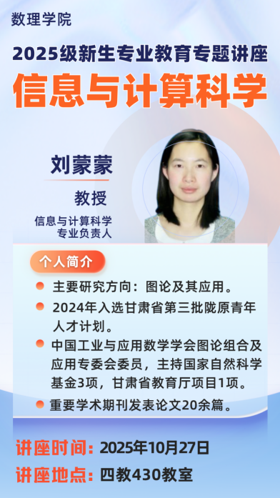 为帮助2025级信息与计算科学专业学生厘清专业认知、搭建核心知识体系、明确四年成长路径,数理学院在10月27日在四教430教室举办信息与计算科学专业认知教育专题讲座。专业主任刘蒙蒙担任主讲。