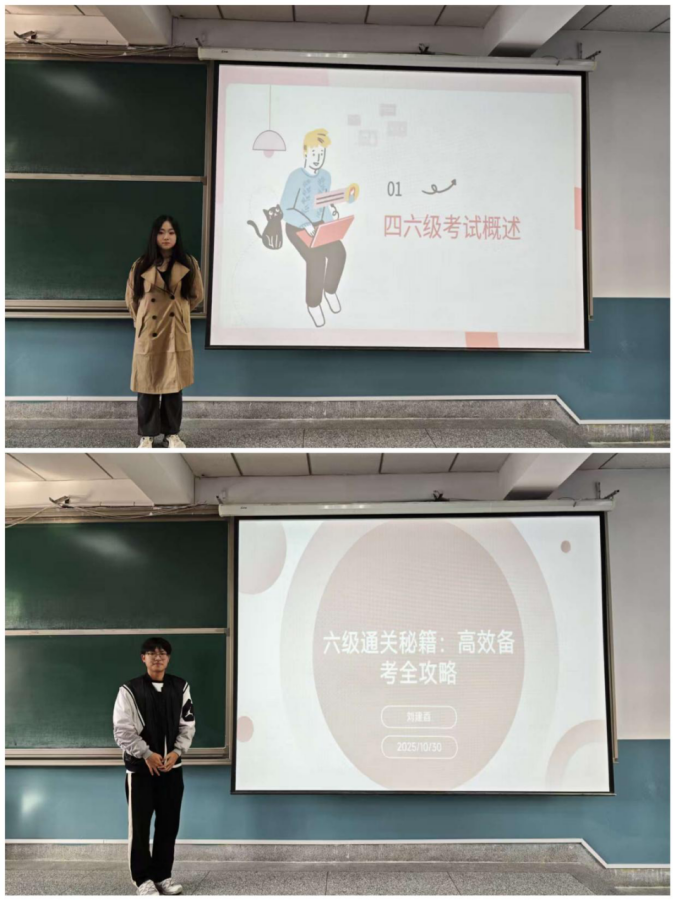 在四六级经验分享及日常习惯方面,王肖语、刘建酉两位同学结合自身四六级通过的经历进行分享。王肖语详解四六级题型与评分标准,针对性给出听力语调识别、阅读快速定位、写作逻辑构建等方法,刘建酉则聚焦六级结构及分值权重,他分享“听力提分快车道”,结合高频考点讲解高效答题策略,给出针对阅读的冲刺方法,帮助新生提升答题速度与准确率;听力、阅读、写作翻译模块,二人各有侧重,王肖语讲解通用技巧、解题步骤及真题分配、心态调整要点,刘建酉提供六级专项提分策略与实用模板,同时还分享习惯养成建议,为新生提供落地学业方案。