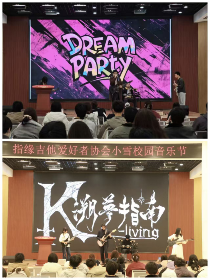活动现场,以《你要跳舞吗》开启篇章,DreamParty梦幻派对乐队凭借独特节奏瞬间点燃全场氛围。随后,K-Living湖梦指南乐队带来《河流》《火车驶向云外,梦安魂于九霄》等经典翻唱曲目,演唱收获了观众的阵阵掌声。李英硕、张国昊、乔欣彤、缪博文、杨文博等同学也依次登台,演绎了《有些》《看月亮爬上来》《someone you loved》《呓语》《无边际》等风格各异的歌曲,充分展现出指缘吉他协会成员扎实的音乐功底与丰富的艺术表达力。此外,音乐会还特别呈现多首原创作品,K-Living湖梦指南乐队的《湖梦指南》、DreamParty梦幻派对乐队的《因你为你》《你我》《梦幻派对》等曲目,既彰显了同学们在音乐创作上的探索与才华,也传递出他们对青春、梦想与生活的独特感悟。