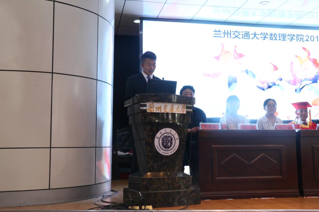 在校生代表数理学院学生会主席窦兴科发言,感谢朝夕与共的师哥、师姐三年大学生活的关心和帮助,并衷心祝愿师哥、师姐们实现自己的人生理想和价值,成为祖国和民族的栋梁,成为兰州交通大学数理学院永远的骄傲!