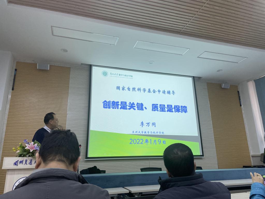 为进一步做好2022年度国家自然科学基金项目申报工作,切实提高申报质量, 2022年1月9日下午,数理学院在第八教学楼D座118学术厅召开2022年国家自然科学基金项目申请辅导报告会。会议邀请兰州大学数学与统计学院院长李万同教授作了专题申报辅导。数理学院申报2022年国家自然科学基金相关教师50余人参加报告会。报告会由副院长邓醉茶主持。
