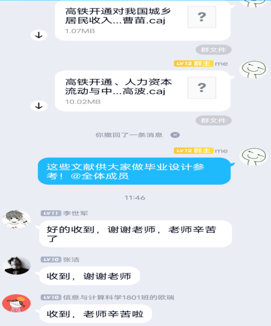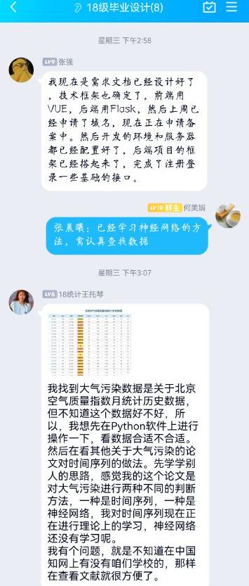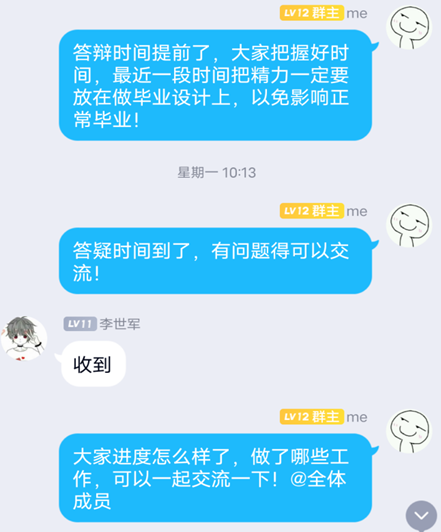数学系何美娟老师采用QQ群和语音相结合的方式进行毕业设计(论文)的指导和答疑工作。由于张强和王托琴同学在校外(西安)做毕业设计,因此在指导中,何老师不仅指导学生论文方面的问题,同时主动了解学生的思想动态,给予学生正面引导,传递正能量。