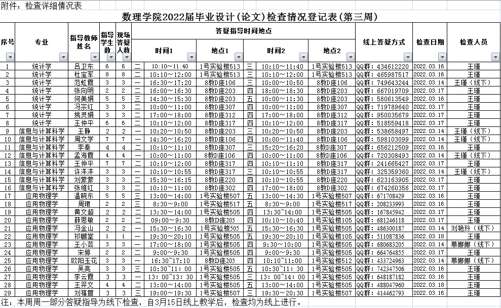 疫情期间,为降低疫情防控对我院2022届本科生毕业设计(论文)工作影响,学院高度重视,成立了由院长孙小伟教授、副院长张睿教授任组长、各系(教研室)主任及学院督导为成员的学院毕业设计(论文)线上工作督导小组,制定了《数理学院本科生毕业设计(论文)督导工作方案》,先后发布《数理学院关于疫情期间做好2022届本科毕业设计(论文)线上指导工作的通知》、《数理学院关于本科生毕业设计(论文)线上督导工作的通知 》等。各位指导教师要充分利用网络、视频、电话、图片等方式和学生开展线上交流,并进行“云上”毕业论文的指导,同时做好毕业设计(论文)过程记录册填写的指导及论文内容方向把握等撰写相关工作;指导教师要充分发挥育人功能,要关爱学生,传播正能量,正面疏导学生及时排解不良情绪,引导学生不信谣、不传谣、不造谣、不发表不当言论。督导小组成员每周抽查三名以上教师答疑指导过程,督促指导教师利用QQ群、微信等多种形式加强对学生的指导,确保线上毕业设计(论文)指导工作按时、有序进行。
