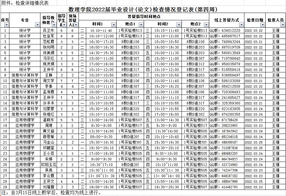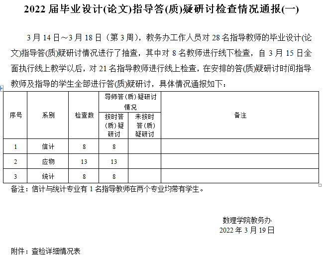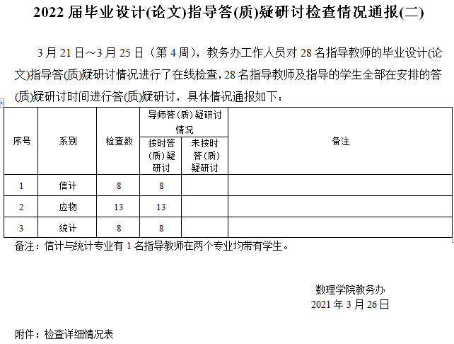 此外,学院教务办坚持日常检查,每周对28名指导教师的毕业设计(论文)指导答(质)疑研讨情况进行了在线检查,并及时发布通报。
