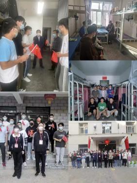 金秋丹桂香满园,红旗招展迎国庆。在举国庆祝中华人民共和国成立73周年之际,为让学生度过一个安全、祥和的国庆佳节,进一步了解校园静态管理期间我校学生的思想动态、心理状况、学习生活情况和实际需求,落实落细疫情防控新形势下的学生管理工作,10月1日下午,数理学院院长孙小伟,党委书记张建刚,副院长张睿、邓醉茶,副书记、副院长陈永锡,辅导员、班主任代表分别到南苑、北苑、桃海三个区域,本科宿舍97间,研究生宿舍70间,传递学院的温暖与关怀,并向学生表达节日祝福。