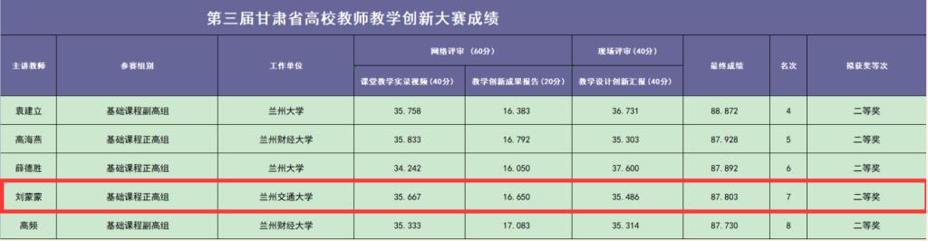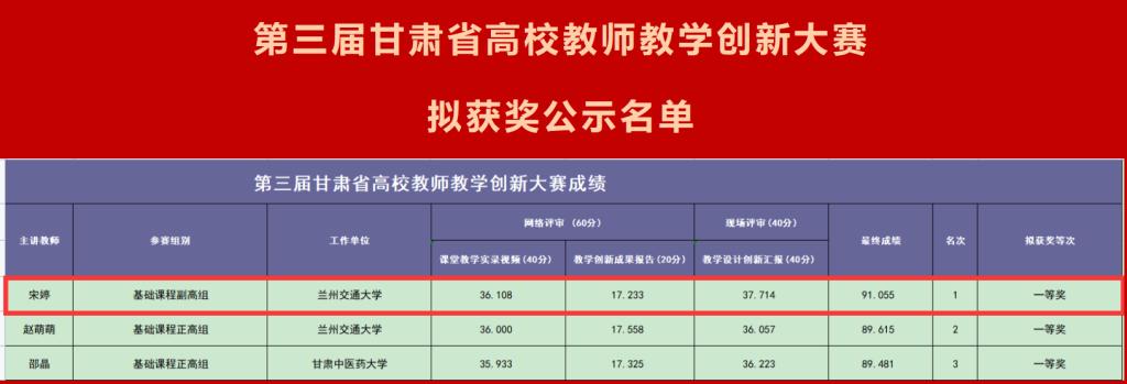 4月15日,第三届甘肃省高校教师教学创新大赛在兰州大学榆中校区举行,我院宋婷博士荣获基础课程组一等奖,刘蒙蒙教授荣获基础课程组二等奖。