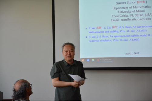 5月21日上午,美国迈阿密大学阮士贵教授,应邀来校在数理学院311会议室做了“关于年龄结构的梅毒传播模型”的专题报告。报告会由兰州交通大学副校长霍海峰主持,学院相关学科负责人、青年教师代表30余人参加了报告会。