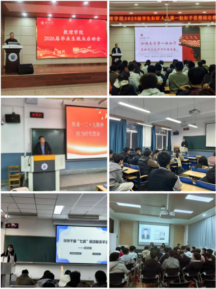 为深入落实立德树人根本任务,切实增强育人工作的亲和力与针对性,本学期数理学院联系领导以习近平新时代中国特色社会主义思想为指引,扎实推进领导干部“七进”工作。通过深入学生群体一线,精准把握学生思想动态,用心用情解决学生急难愁盼问题,搭建师生深度沟通的坚实纽带,切实把“围绕学生、关爱学生、服务学生”的理念落到实处,持续深化“三全育人”成效,凝聚育人合力,为学生全面成长成才保驾护航。