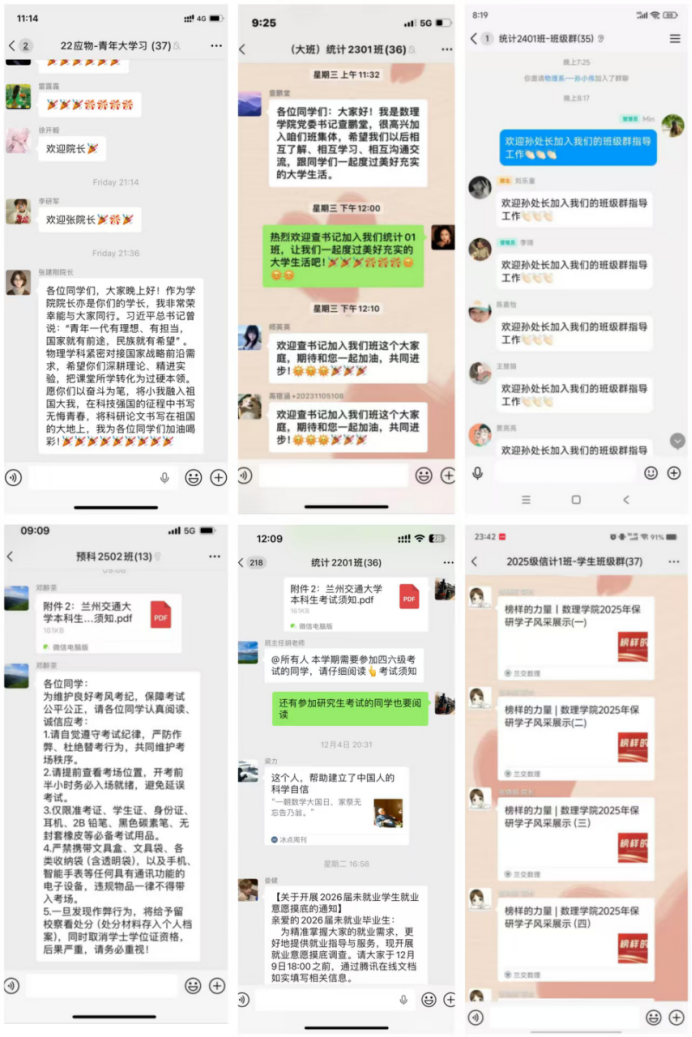 学院领导干部主动依托微信、QQ等线上平台,加入学生班级群、社团群等各类学生群体组织,化身“线上联络员”与“成长引路人”。根据联系班级实际情况,精准为学生提供学业规划指导、榜样风采、就业方向指引等多元化服务。通过线上实时互动及时掌握学生思想动态与内心诉求,高效回应政策咨询、解答成长困惑,针对性推动解决学生在思想认知、心理调适、就业求职等方面的实际问题,让网络阵地成为密切师生联系、精准服务学生的重要桥梁,筑牢线上育人防线。
