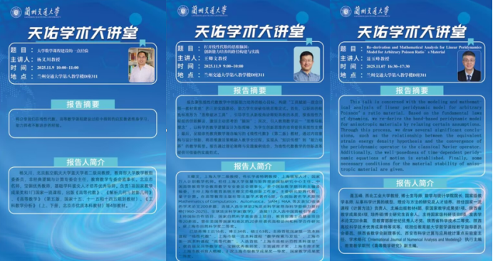 学术研讨板块作为本次文化月的核心内容,“天佑学术大讲堂”系列活动好戏连台。自 11 月以来,学院先后邀请多位国内外知名专家学者开展学术交流与报告:西北工业大学聂玉峰教授、上海大学王卿文教授、北京航空航天大学杨义川教授等国内顶尖学者莅临学院,与师生们围绕学科前沿问题展开深度研讨;美国西弗吉尼亚大学赖虹建教授、德国 Bielefeld 大学 Henning Krause 教授等国际专家通过线上或线下形式带来精彩学术报告;西安电子科技大学白振国教授、广东技术师范大学梁海华教授、西北工业大学刘晓刚副教授等学者也纷纷带来前沿学术分享。系列学术活动涵盖数学、物理、统计领域多个研究方向,为全院师生搭建了高水平的学术交流平台,拓宽了学术视野,促进了学科交叉融合,进一步提升了学院的学术氛围与科研水平。