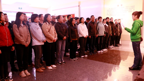 创党坚贞传后世,为国浴血染山红。参观伊始,全体党员在纪念像前默哀鞠躬。面对鲜红的党旗,全体党员同志重温入党誓词,在铿锵有力的宣誓声中,大家的思绪被拉回到那段充满奉献与牺牲的岁月,仿佛回到了那个战火纷飞的年代。