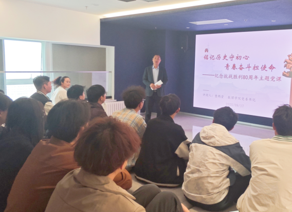 党委书记查鹏堂作《铭记历史守初心青春奋斗担使命——纪念抗战胜利80周年主题党课》,从“为什么要铭记历史?——00后需要知道的历史三问”,“怎样才算爱国?——从‘知道’到‘做到’的青春答案”,“给00后的青春宣言——我们这样纪念胜利”三个方面,结合详实的史实与当代案例,紧扣时代脉搏与青年特点,阐明铭记苦难与辉煌是坚守初心的根基,解答“知”与“行”的统一命题,并发出强有力的青春宣言,激励00后担当民族复兴使命。党课史论结合,情理交融,有效强化了学生党员的理想信念与历史责任感。