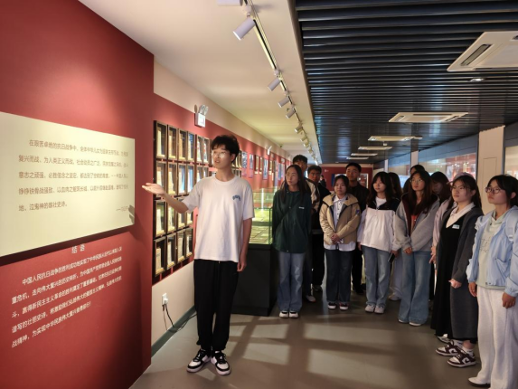 统计学党支部曹立贤担任“全民抗战”板块讲解员,他围绕“‘全民抗战’的历史镜像”“伟大抗战精神的深刻内涵”“从历史中汲取时代力量”“以行动赓续红色血脉”四个维度展开详细解读,着重强调党员及学生干部需深刻领会抗战精神的时代价值,从历史经验中凝聚前行力量。统计学党支部党员穆俊阳结合“九一八事变”历史背景,对展览三个板块进行提纲挈领地介绍,帮助参与人员深化对展览背景及核心意义的认知。