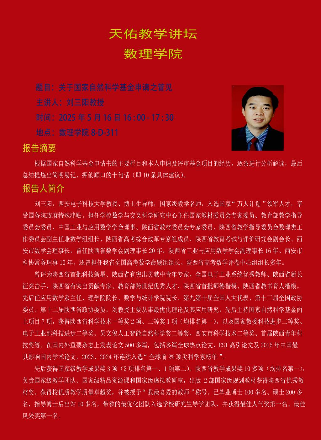 应兰州交通大学数理学院院长张建刚教授邀请,西安电子科技大学刘三阳教授将于2025年5月16-18日访问我校,并于5月16日下午举行《关于国家自然科学基金申请之管见》的专题报告,欢迎各位老师参与交流。
