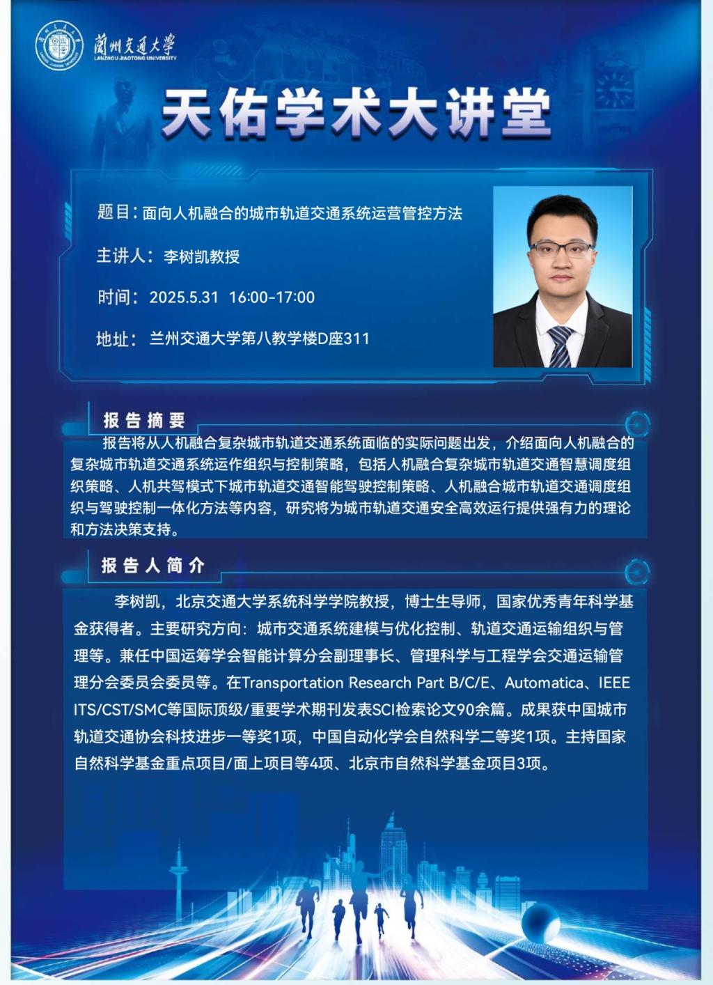 报告摘要:报告将从人机融合复杂城市轨道交通系统面临的实际问题出发,介绍面向人机融合的复杂城市轨道交通系统运作组织与控制策略,包括人机融合复杂城市轨道交通智慧调度组织策略、人机共驾模式下城市轨道交通智能驾驶控制策略、人机融合城市轨道交通调度组织与驾驶控制一体化方法等内容,研究将为城市轨道交通安全高效运行提供强有力的理论和方法决策支持。