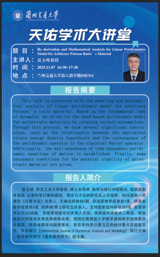 应兰州交通大学数理学院院长张建刚教授和周文学教授邀请,西北工业大学数学与统计学院院长聂玉峰教授将于2025年11月6-7日与我系相关师生进行学术研讨,并于11月7日下午举行学术报告,欢迎各位老师和研究生同学参加。