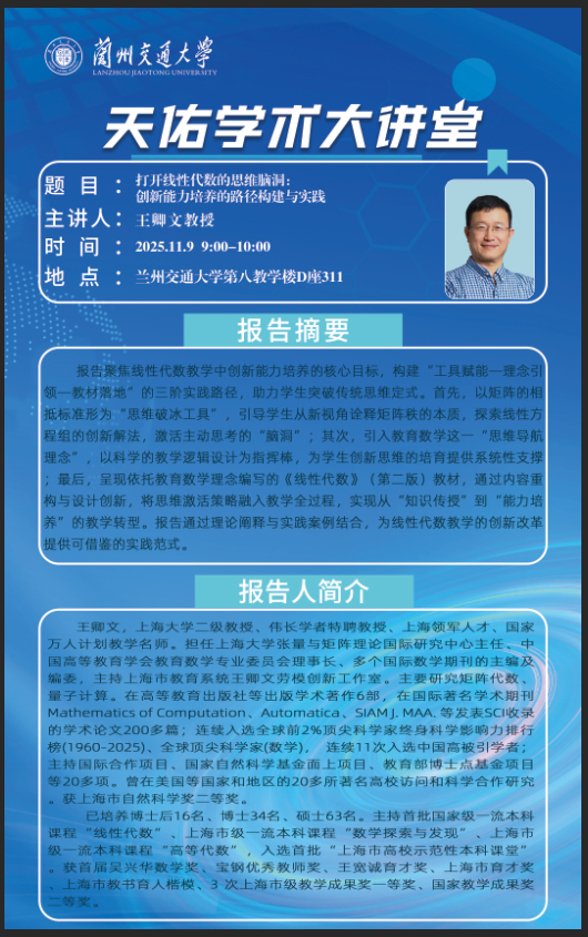 应兰州交通大学数理学院邀请,上海大学王卿文教授将于2025年11月7-9日与我院相关师生进行教学学术研讨,并于11月9日上午举行学术报告,欢迎各位老师和研究生同学参加。