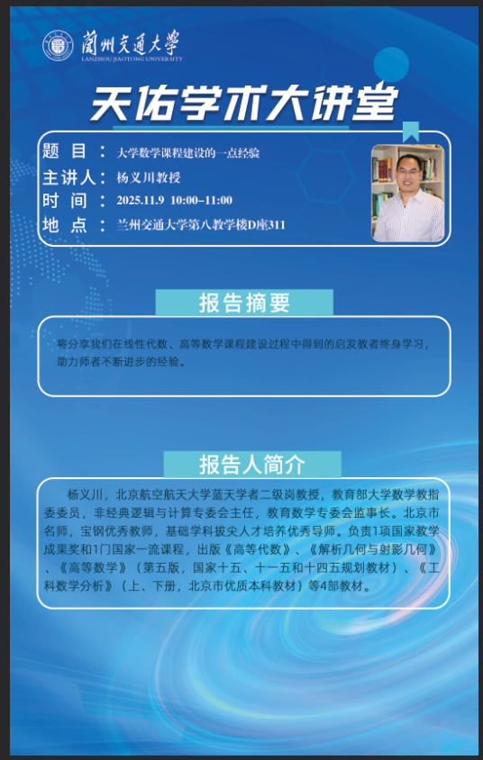 应兰州交通大学数理学院邀请,北京航空航天大学杨义川教授将于2025年11月7-9日与我院相关师生进行教学学术研讨,并于11月9日上午举行学术报告,欢迎各位老师和研究生同学参加。