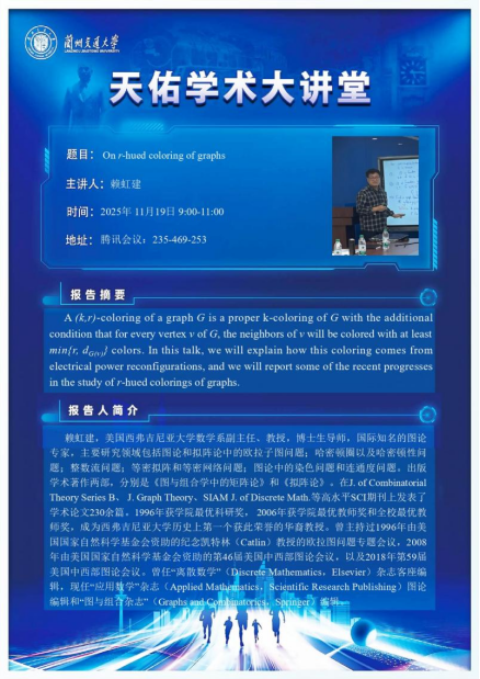 “天佑数学讲坛”由兰州交通大学数理学院发起创办,是数理学院数学系高层次常态化的学术交流平台。讲坛将不定期邀请国内外知名学者围绕数学国际前沿动态展开学术交流与探讨,通过学术报告、小型研讨会等形式为数学系师生提供向国内外知名学者学习的机会,以便能够及时准确地了解数学领域的前沿学术信息,进一步提升数学系师生的学术视野及科研水平。